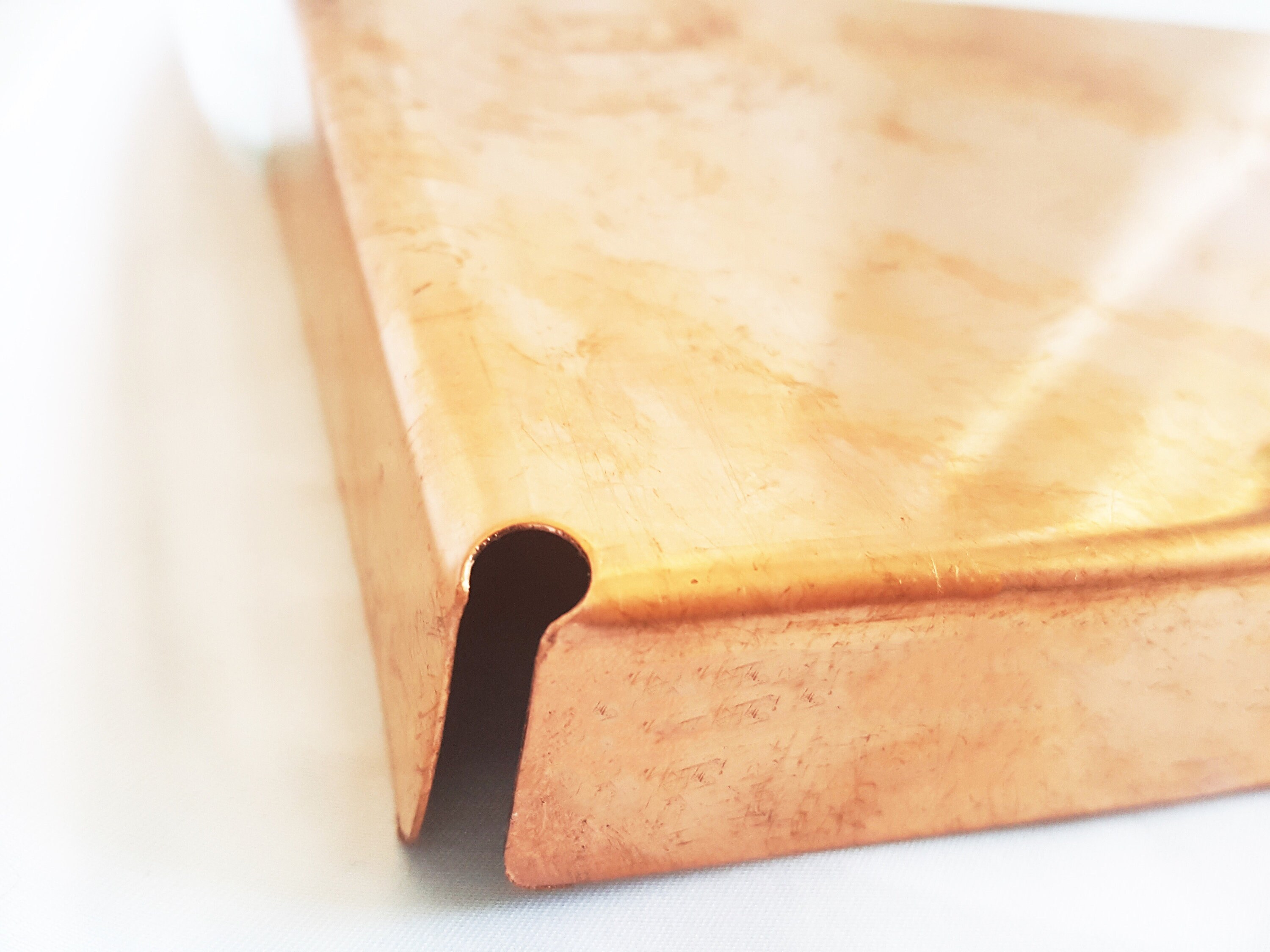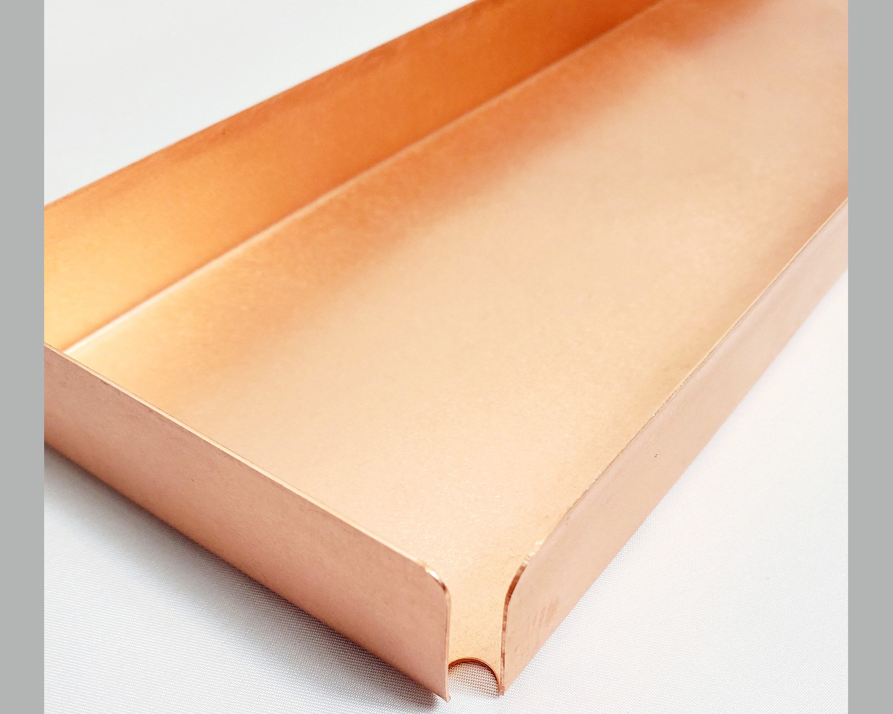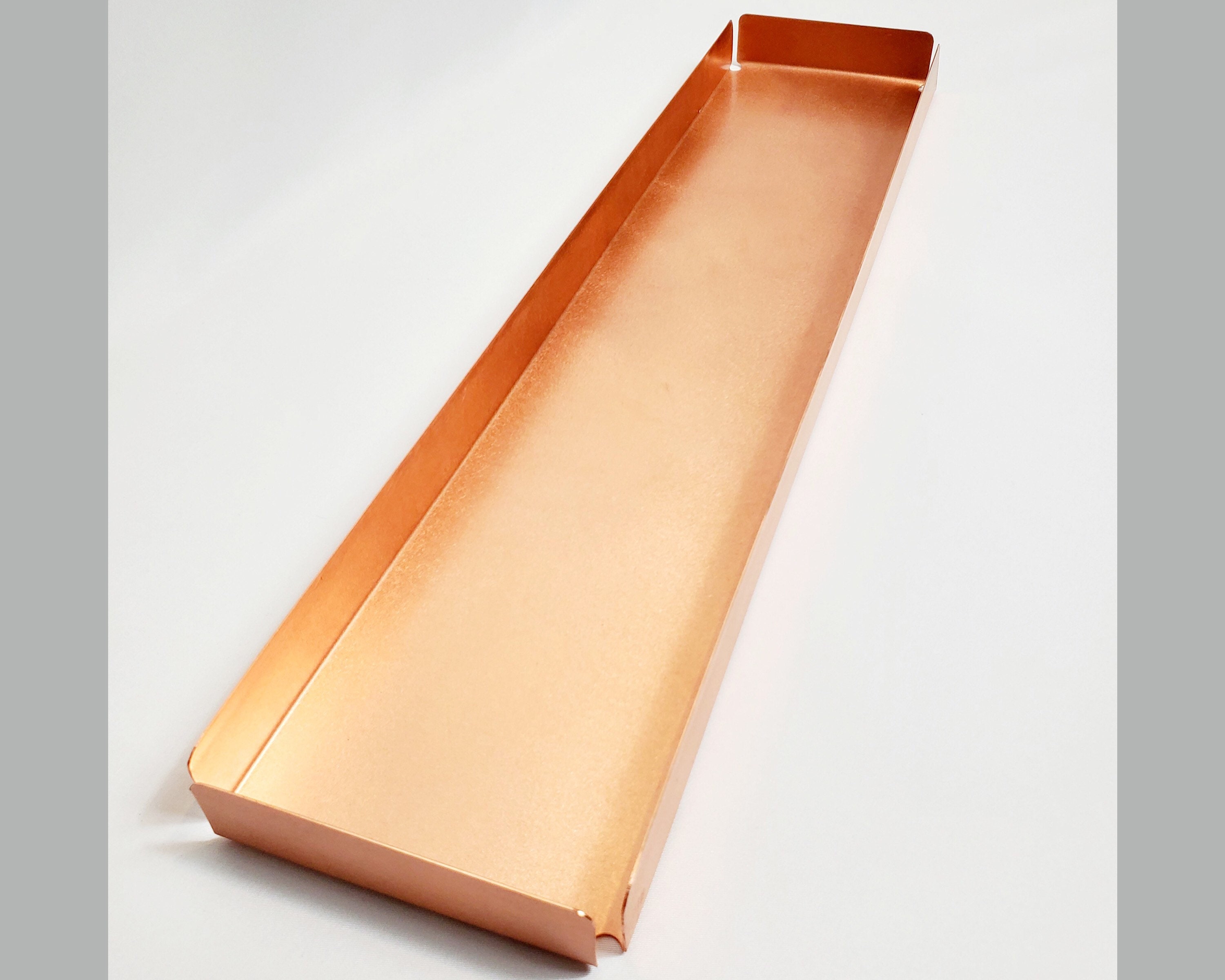 Solid copper rectangular tray with open corners. Perfect fo displaying greenery or fruit. Also great as a catchall for jewelery, pens or hairpins. Indoor or outdoor use. Copper will age naturally to a rich bronze patina. To restore copper shine finish, buff it with copper polishing cream.