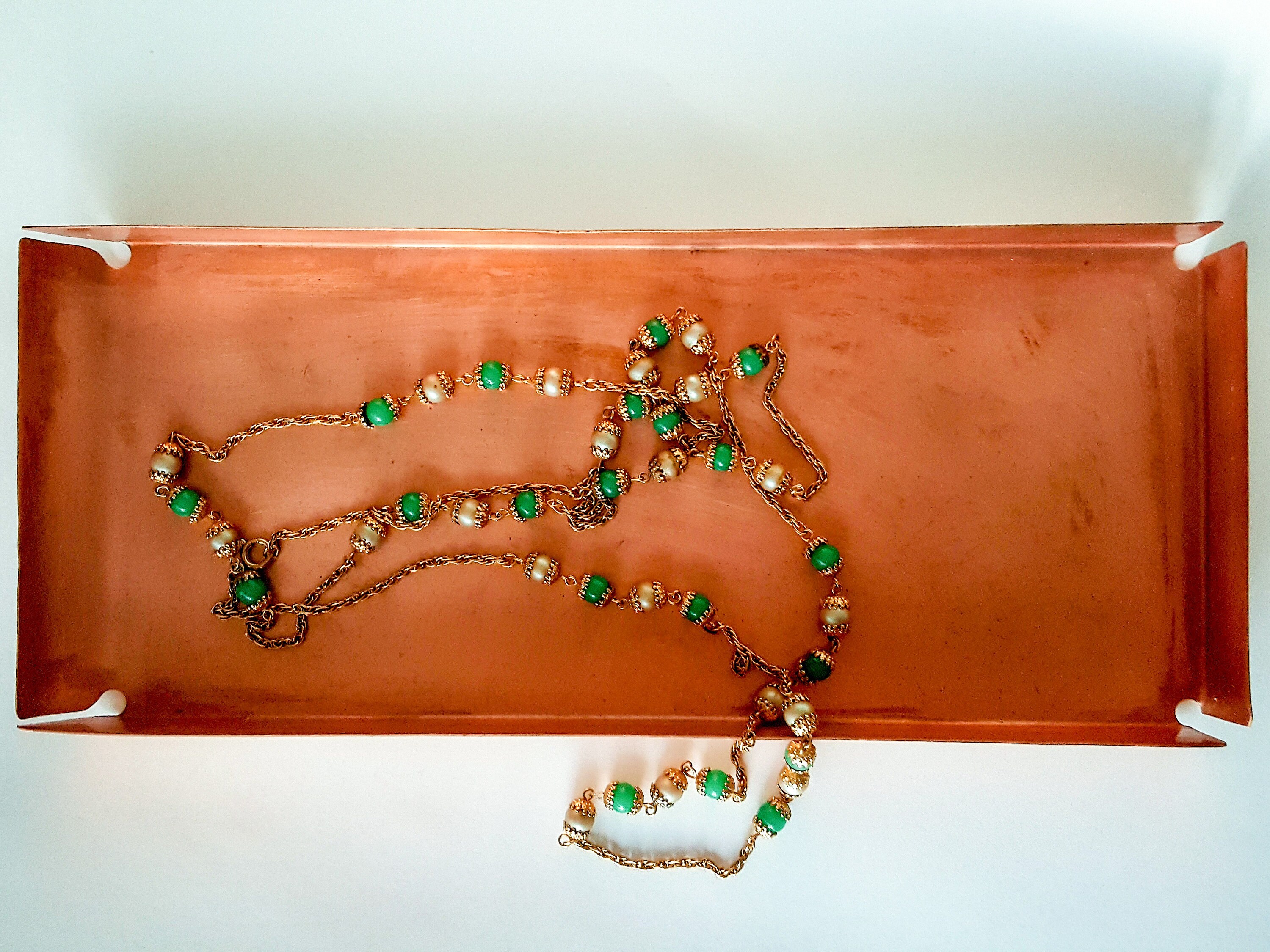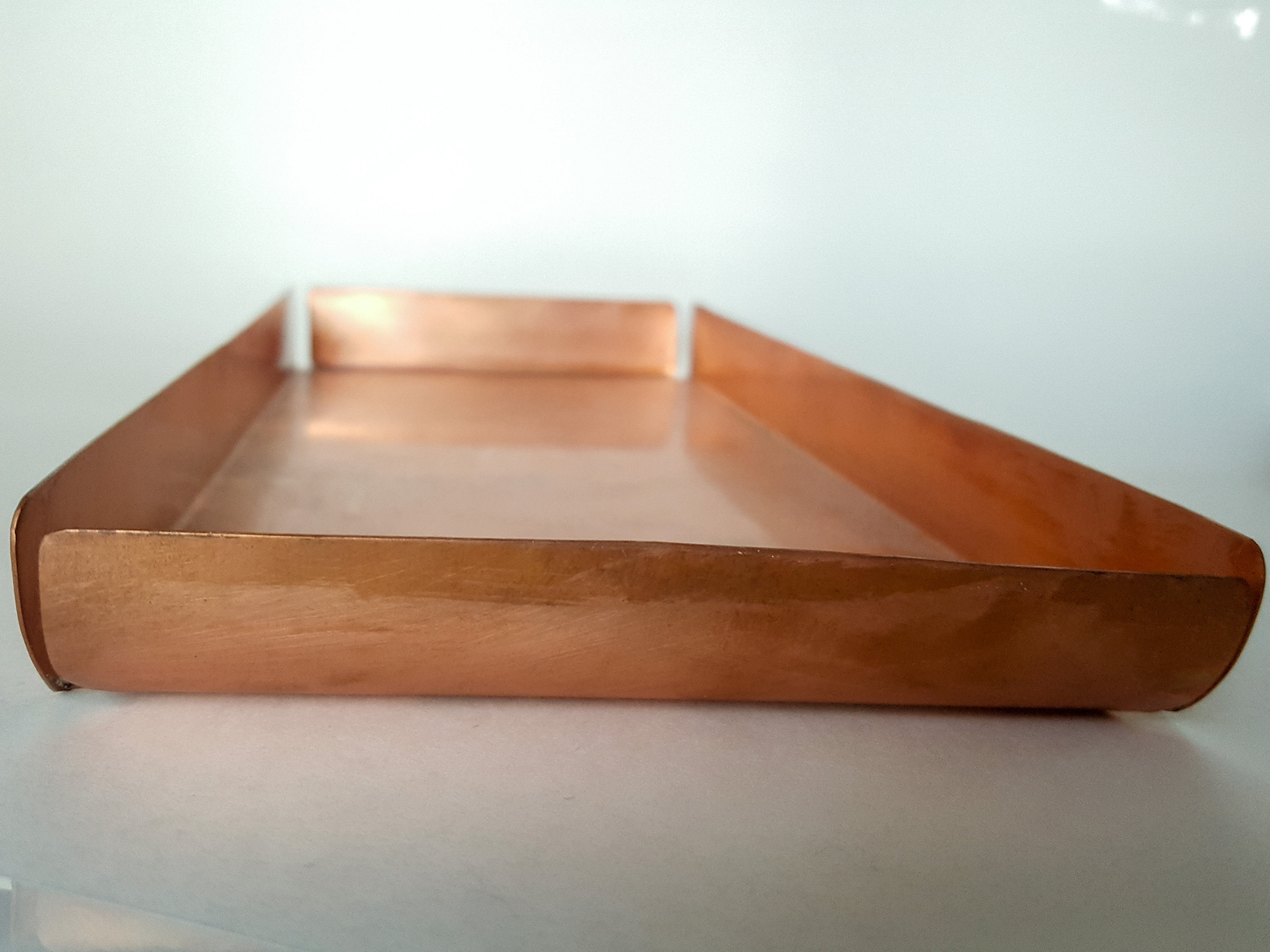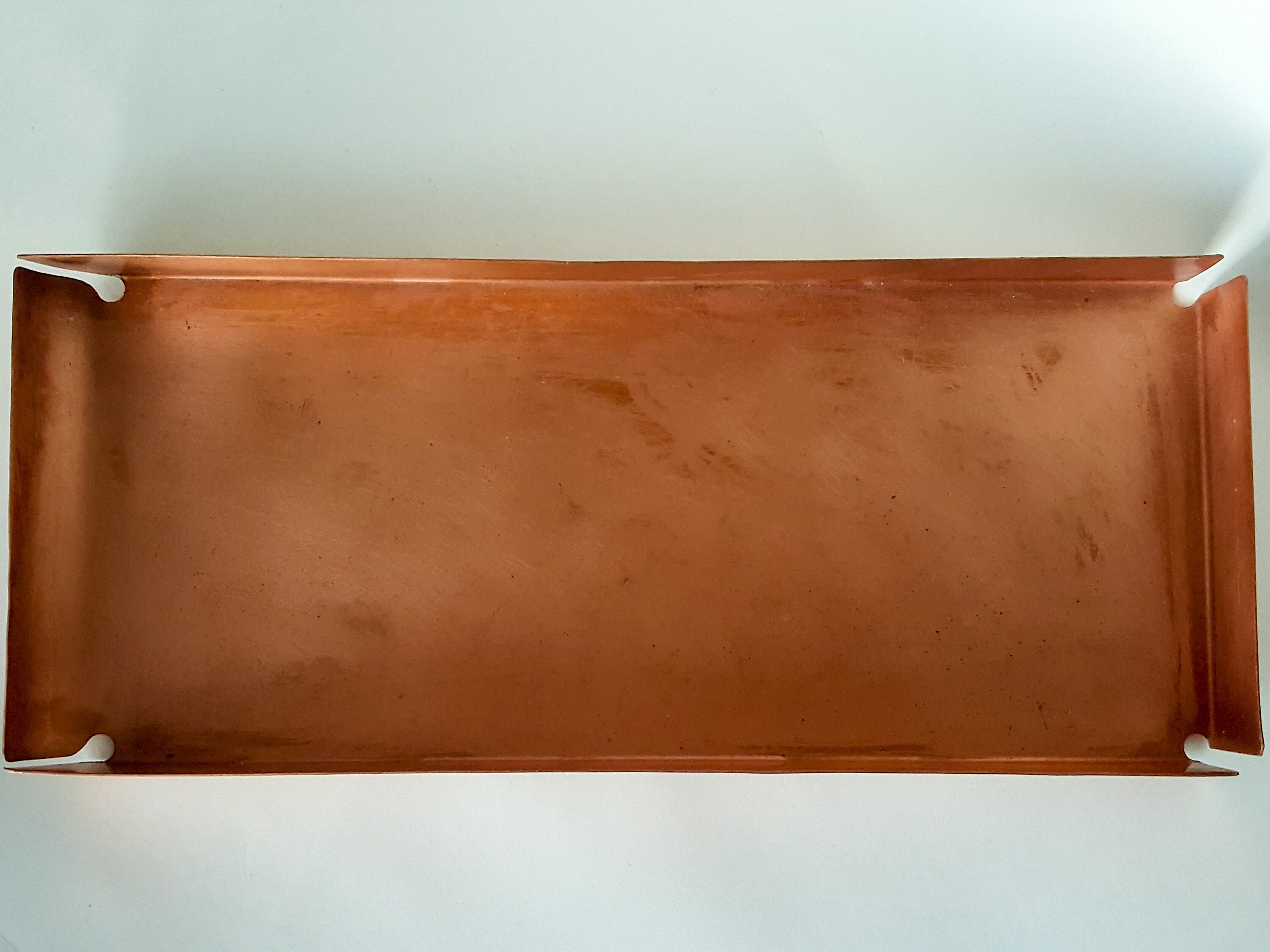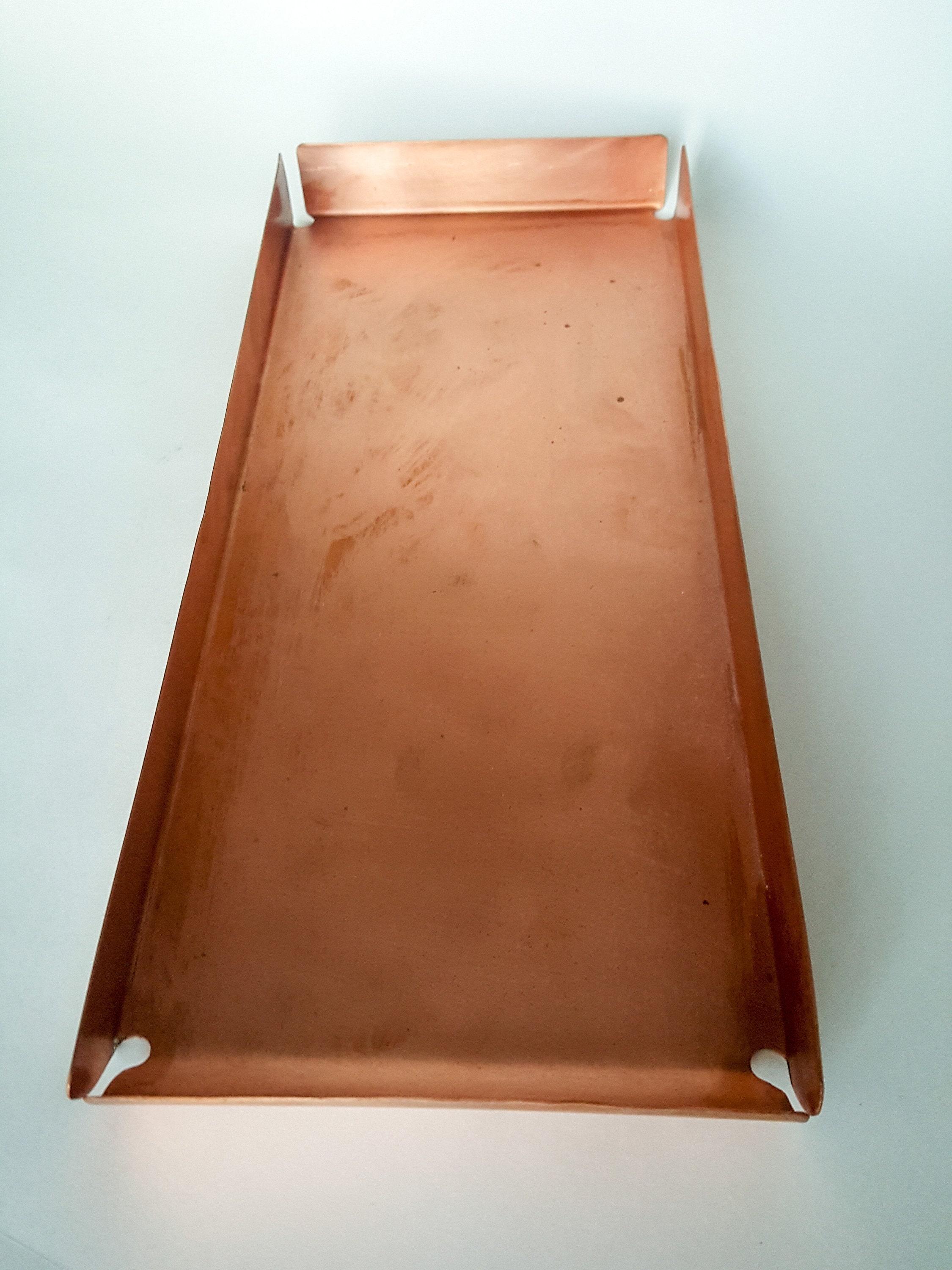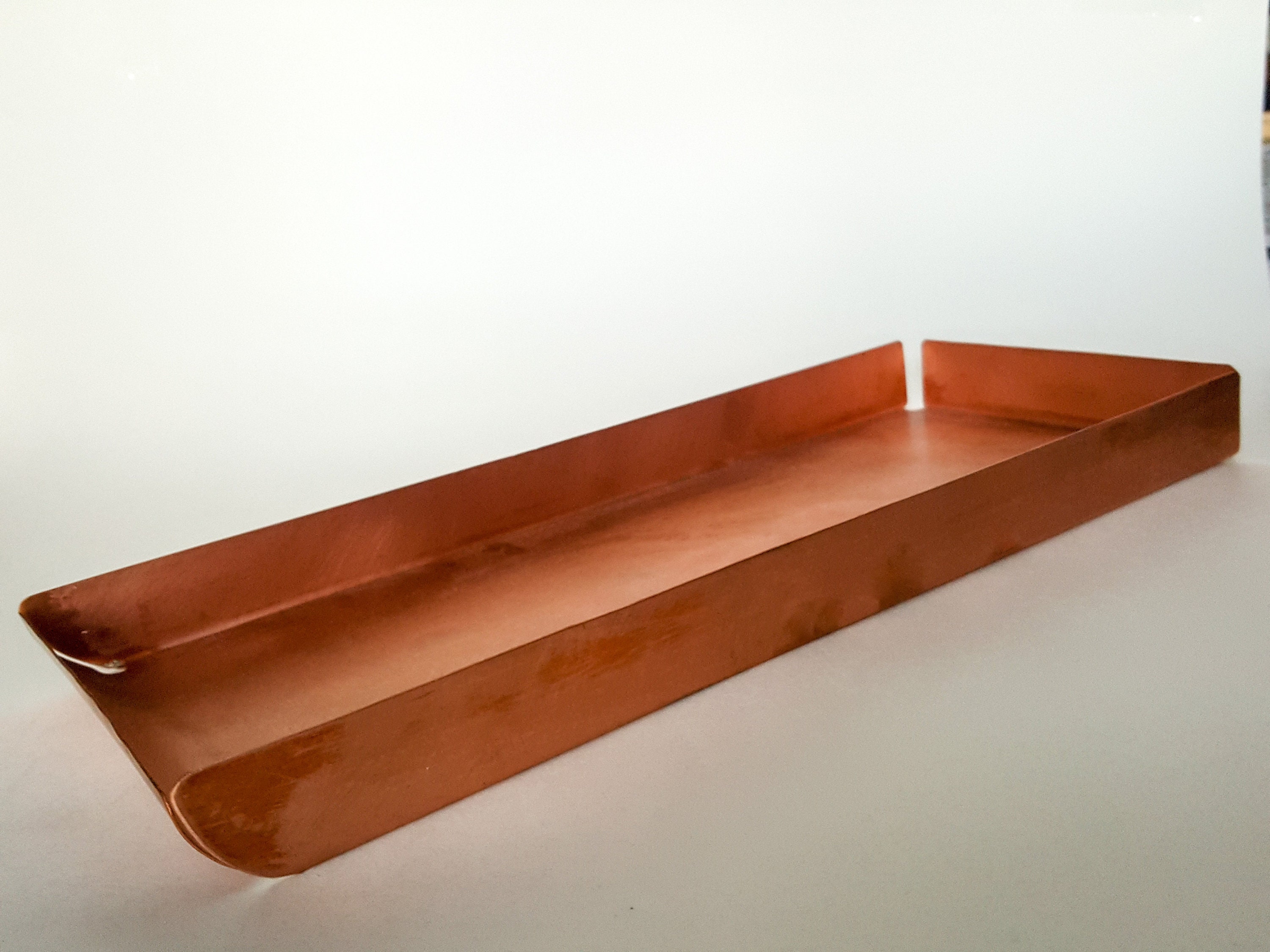 Handcrafted Copper rectangular tray with open corners and one curved end. It’s made of 20oz Copper.
