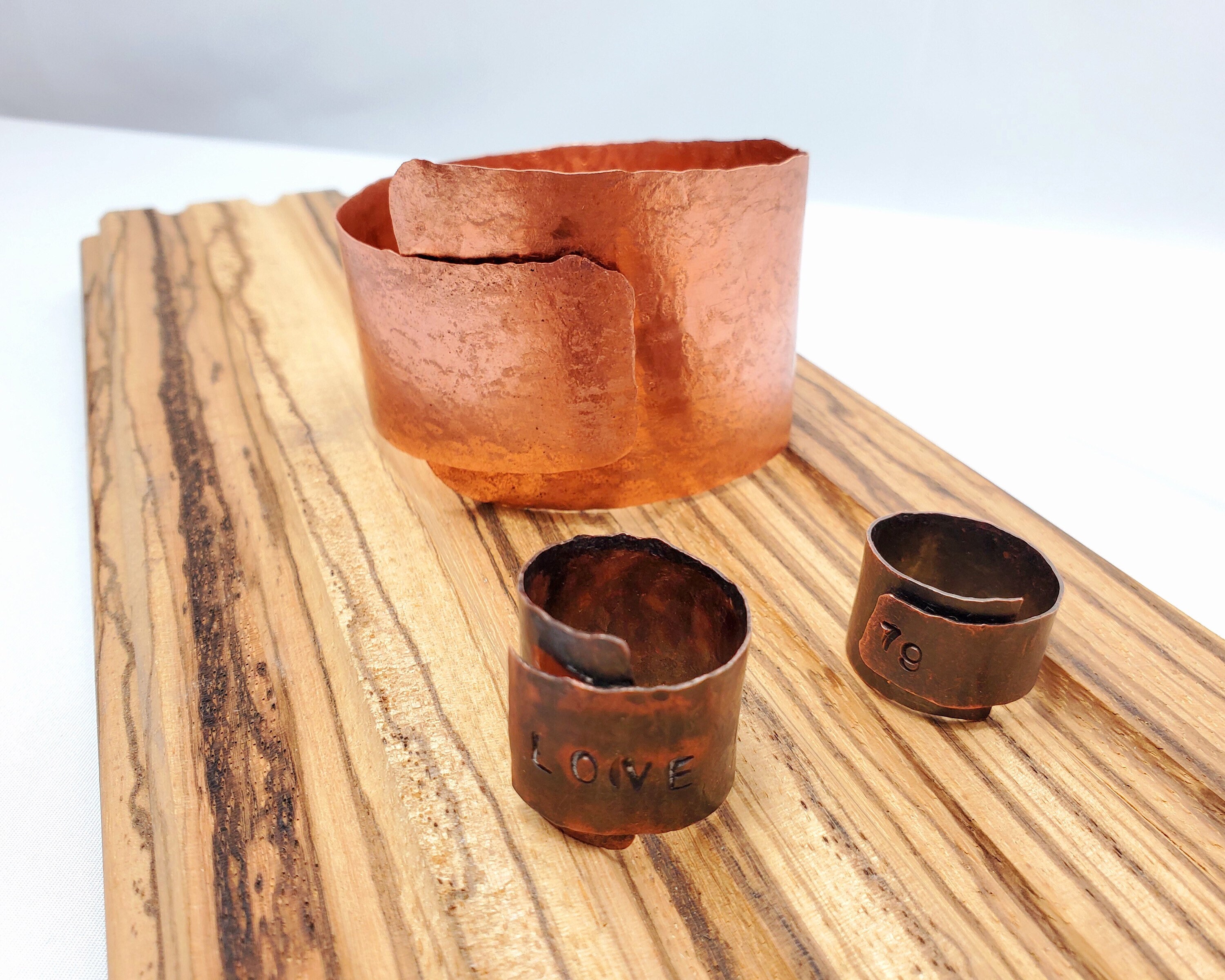 Rugged and rustic unisex rings. Hand stamped, 3/4” wide copper band, beautifully finished with hammered edge. Personalize them your way, shown with “LOVE”. These are solid copper so the patina will get darker over time. To keep it shiny, buff with polishing cloth. These are also great as His and Hers couples ring set. Available in sizes 6-12.