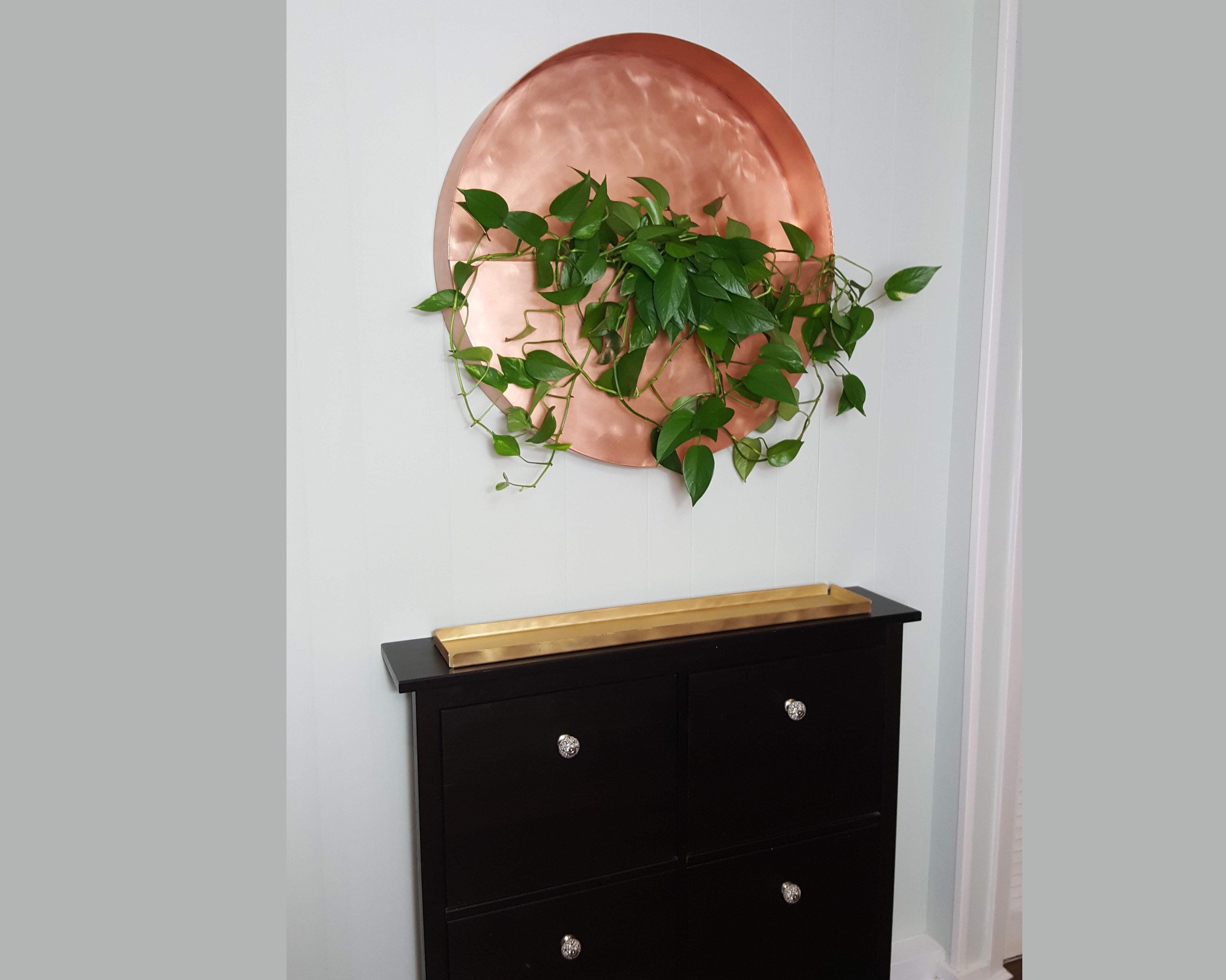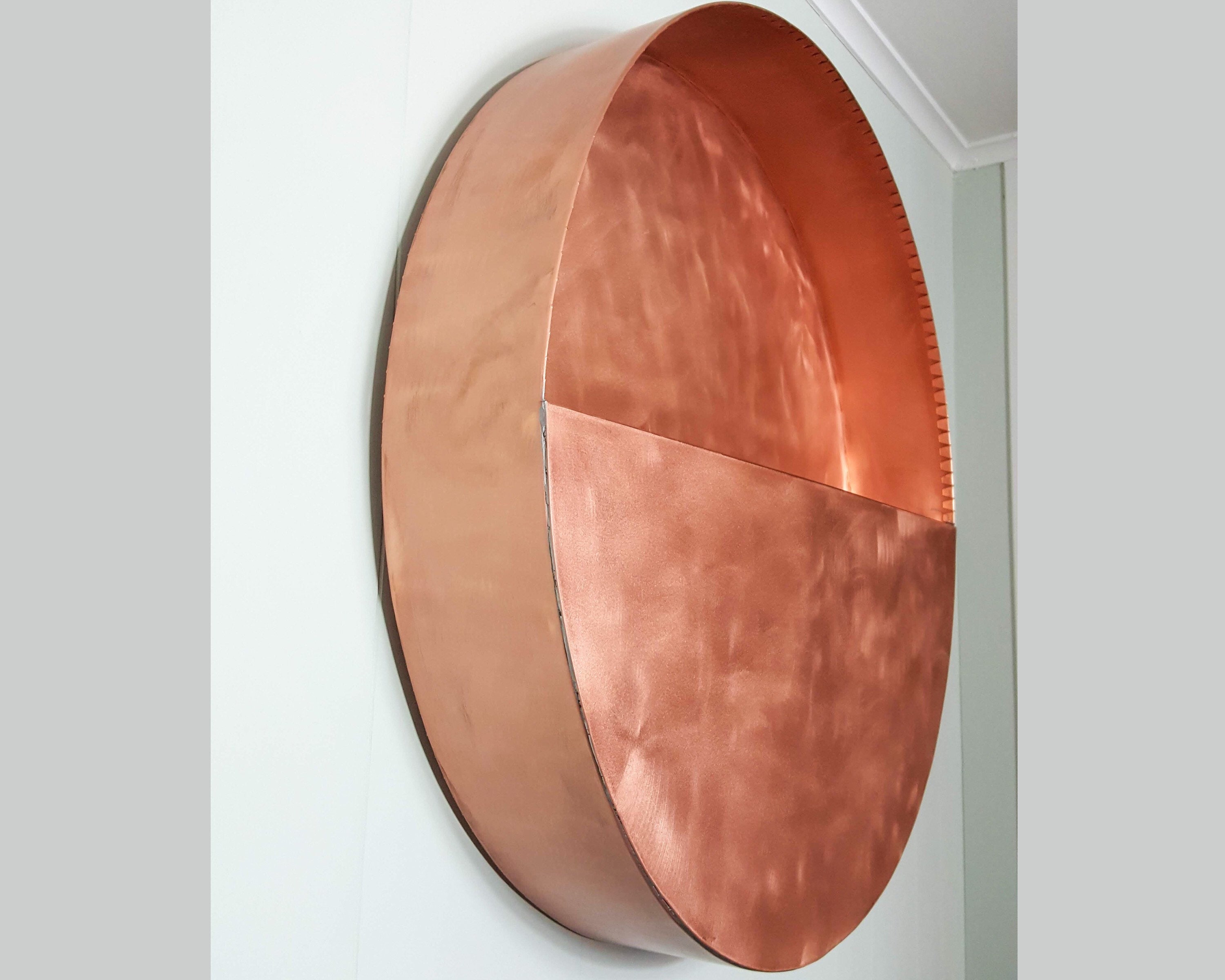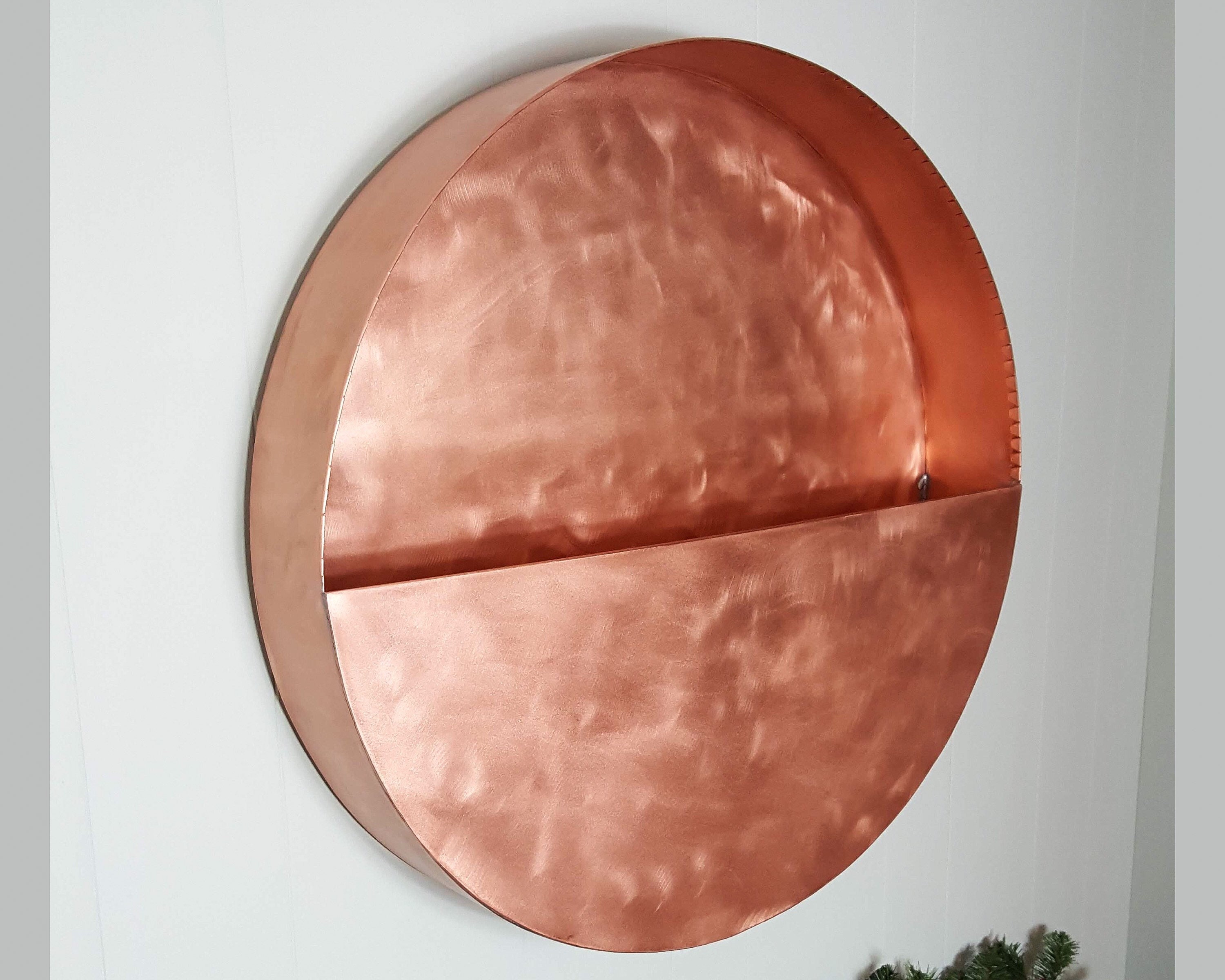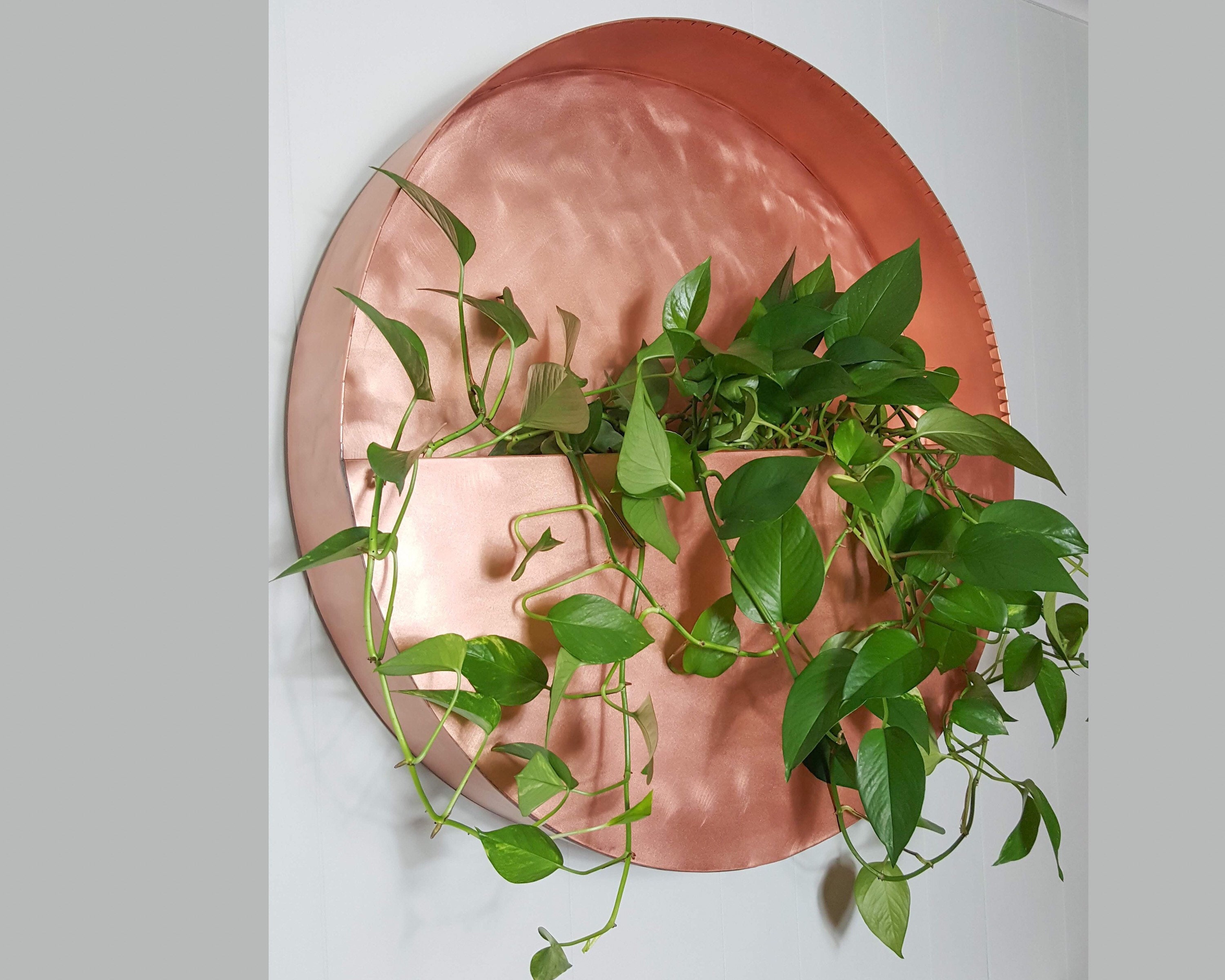 Add a pop of greenery to an empty wall with this hanging copper planter. Measuring 24”H x 24”W x 4"D circular silhouette with a half-circle lip to keep flowers safely in place. Great for displaying fresh potted flowers or artificial succulents. Mounting brackets are included. Planter is made of 20oz copper. Copper will age naturally to a rich bronze patina. To restore copper shine finish, buff it with copper polishing cream.