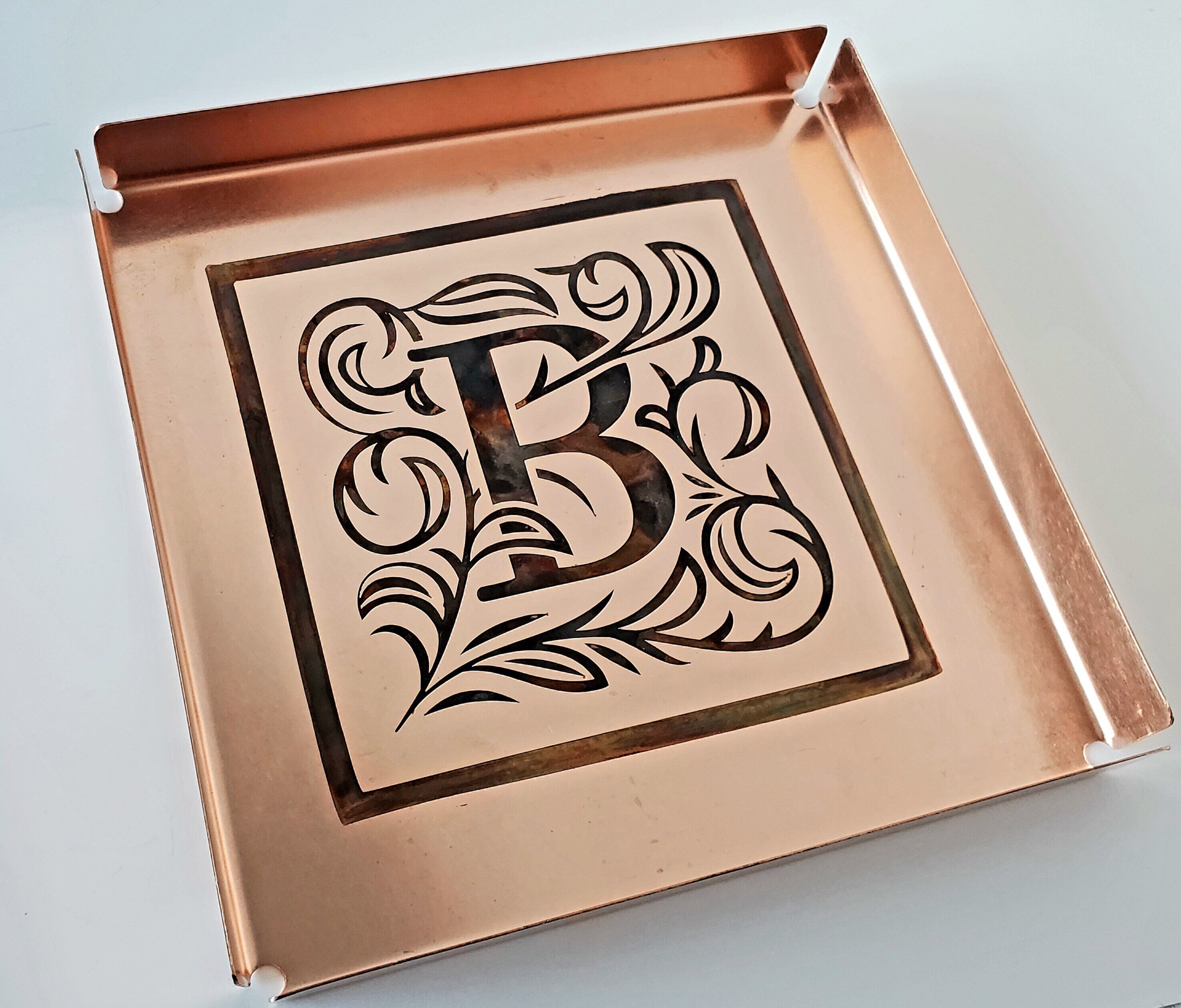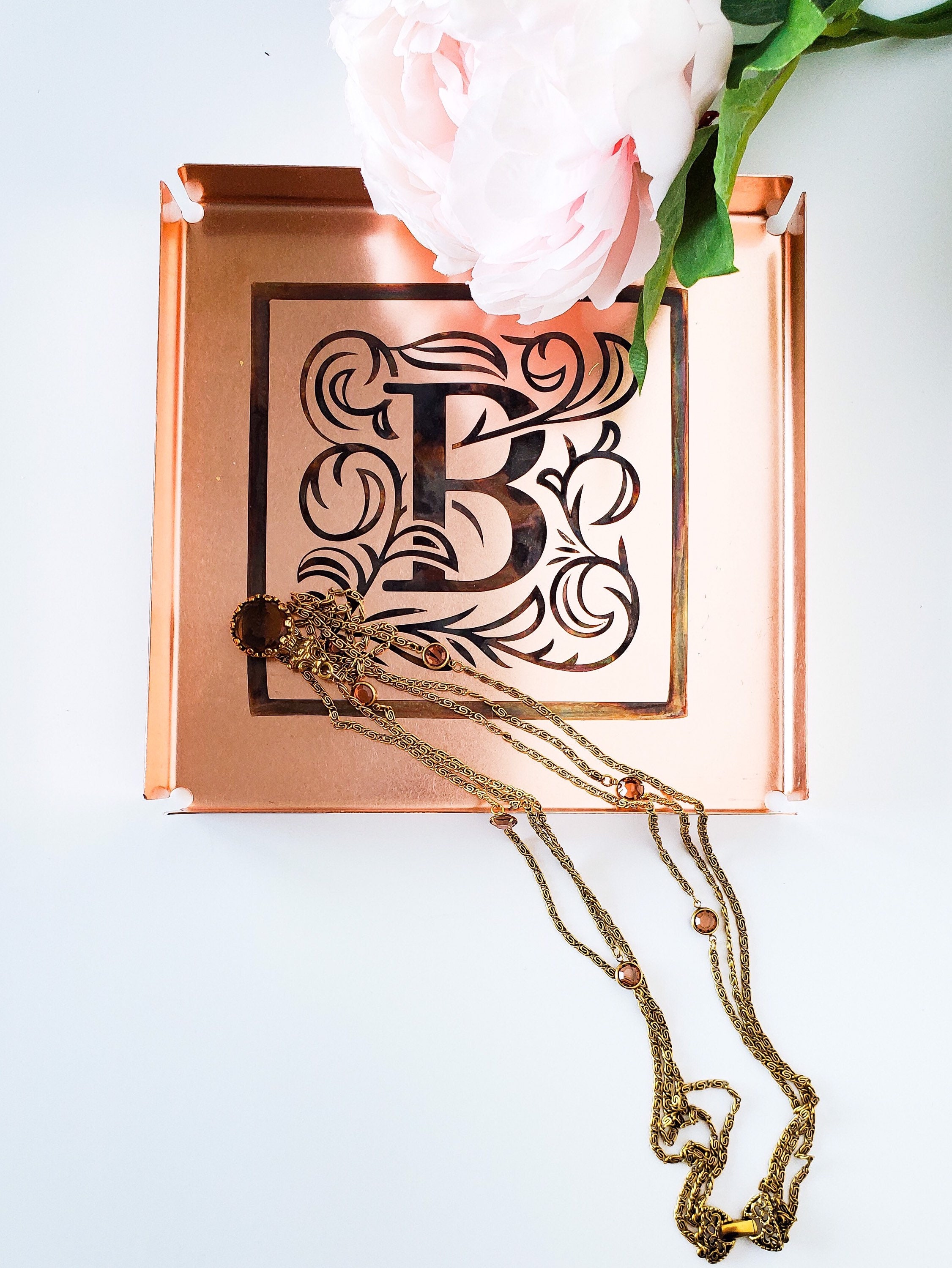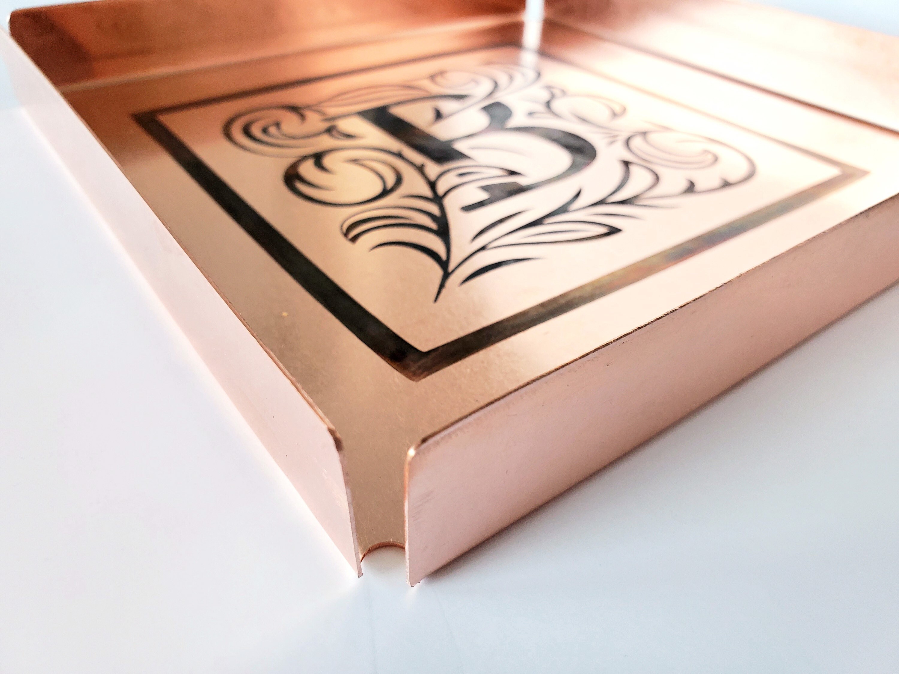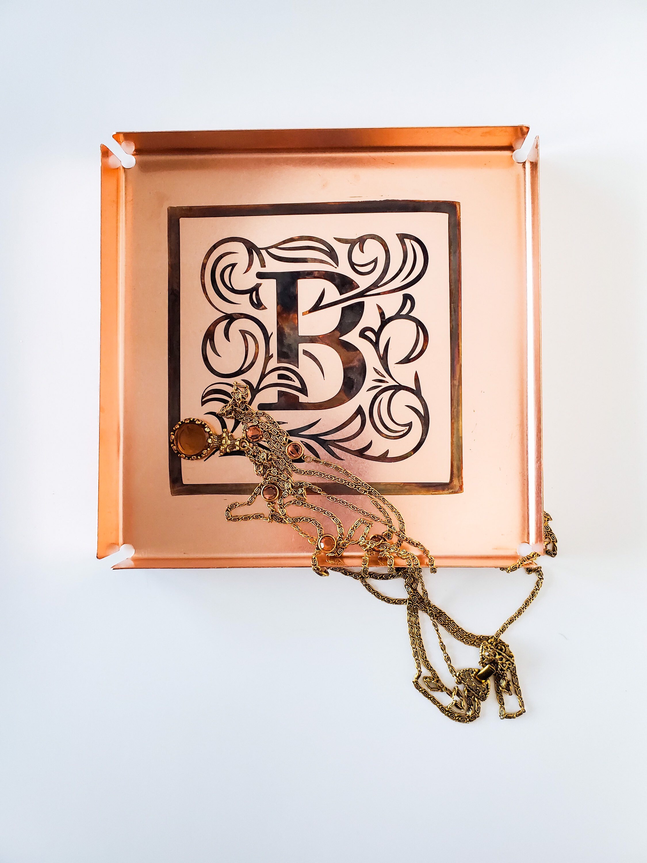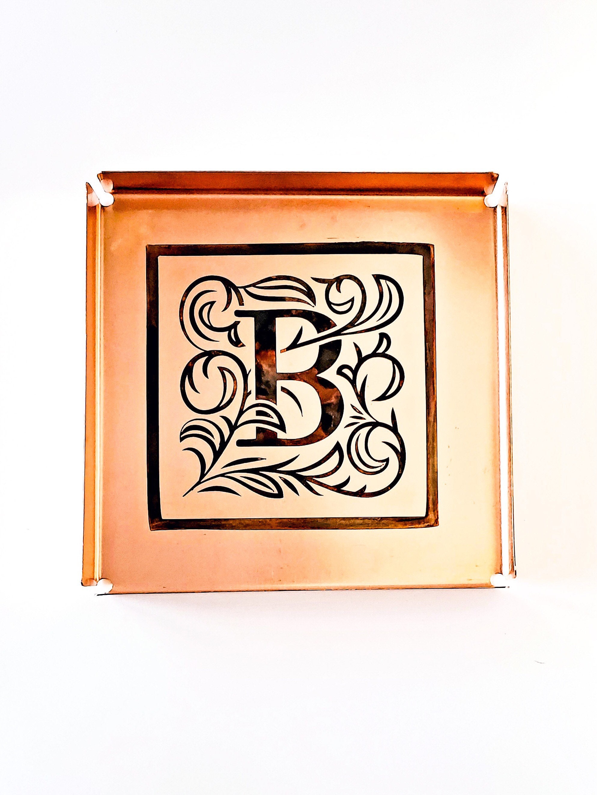 Our personalized, monogrammed catch all tray is perfect gift for your loved ones. Tray is made from solid copper. Monogram is stenciled patina. Tray is waxed to protect copper from tarnishing.